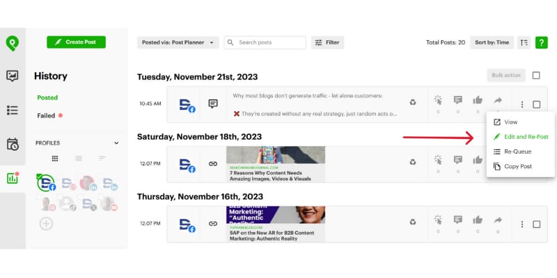 You can also view past performance in the "History" tab to identify posts worth recycling.