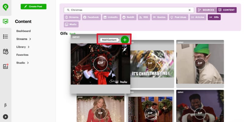 Click "Add Content" on posts you want, fill in captions and hashtags, and repeat until your calendar is full.