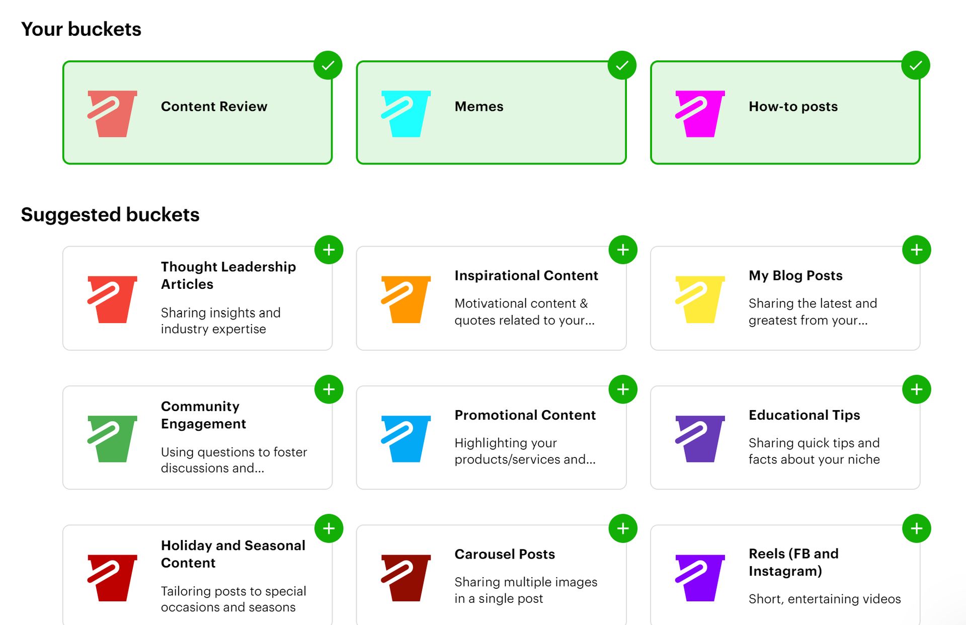Buckets let you categorize content - like memes for Fridays and educational posts for Monday through Thursday.