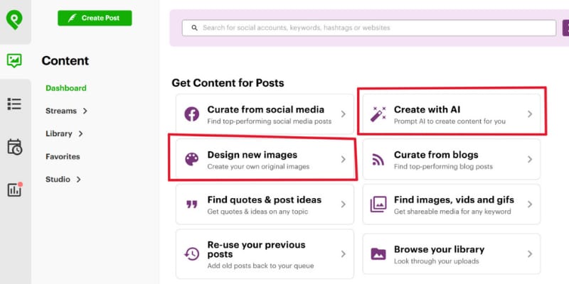 Post Planner offers an AI tool to spark ideas and a design studio to create custom visuals.