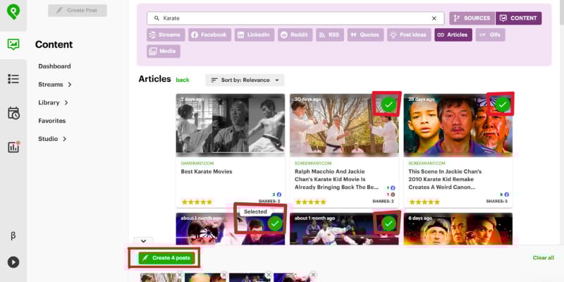 Select all the content you want and click "Create [#] posts".