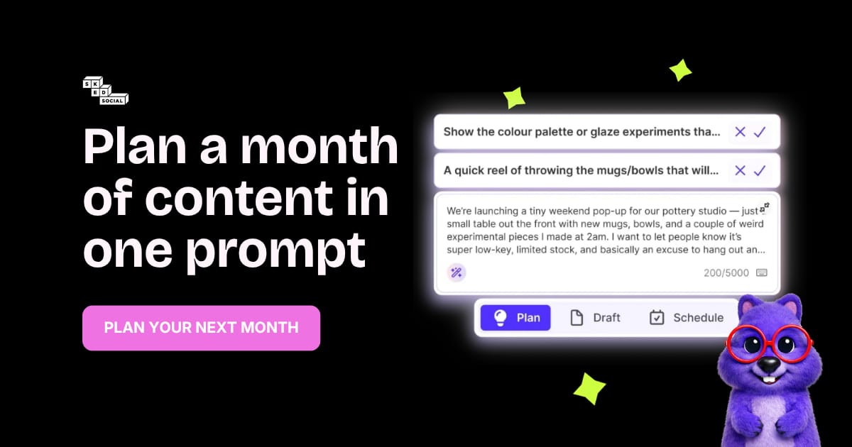 With the right prompt, Sked Ideas can map out a full month in seconds — like “4 posts for every Tuesday in April.”