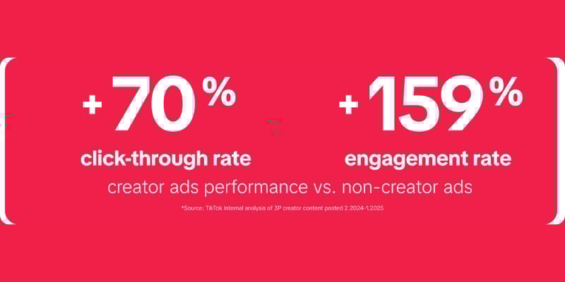 TikTok creators outperform standard ads by 159% in engagement. TikTok reports that creator content gets 70% higher CTR and 159% more engagement than standard ads, and creators produce high-quality, culturally relevant content fast.