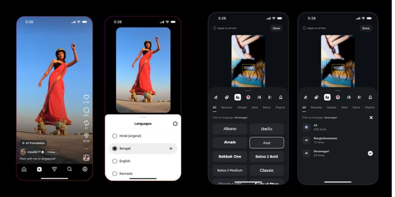 Instagram adds AI voice translations for five Indian languages. Meta AI now translates and dubs Reels into Bengali, Tamil, Telugu, Kannada, and Marathi while preserving tone and lip-sync. Edits adds Devanagari and Bengali-Assamese fonts, speeding localization and widening regional reach.