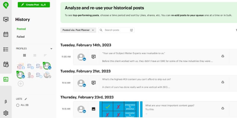 In Post Planner's "History" tab, sort by engagement metrics to analyze which times worked best for you.