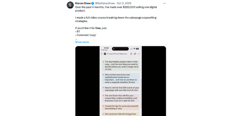 Kieran Drew offered a free copywriting course that required people to comment, follow, and then join his email list through an auto-DM.