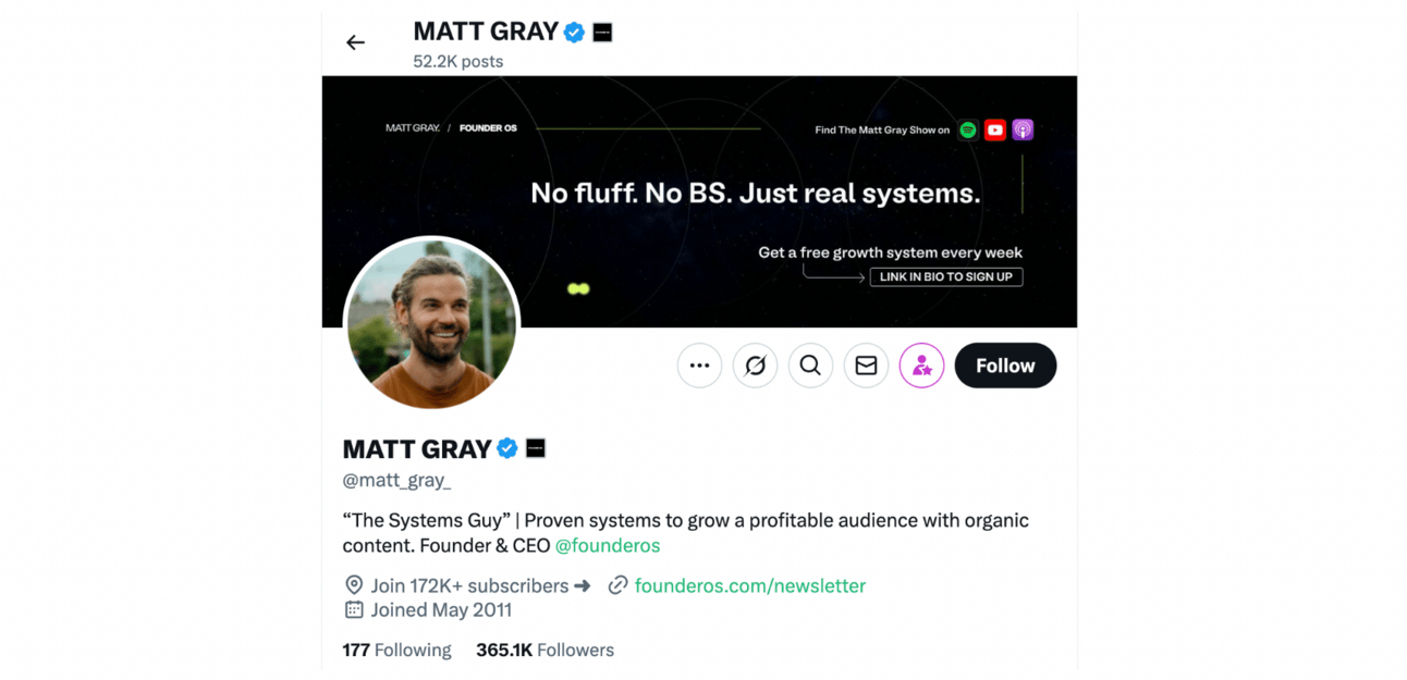 Matt Gray (making a casual $700K per month 🤑) puts a newsletter link right in his X bio. Simple but crazy effective – his list is now 172,000 strong. 📈