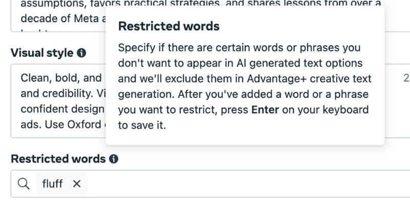 Meta adds a restricted words option for AI ad copy. Marketers can now block specific terms from appearing in AI-generated Facebook and Instagram ad text, giving you tighter control over brand voice when using Advantage+ campaigns.